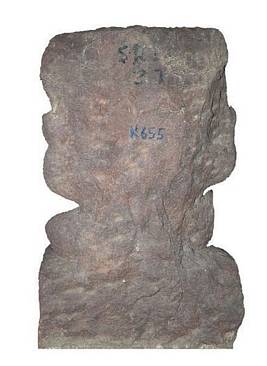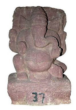 | Description / विवरण | Ganesa seated in ardha paryankasana posture. The head is decorated with karandamakuta in receding tiers. The two rear hands hold damaru and pasa, while the two front hands are in abhaya-mudra and the other holding the modaka. The trunk is represented very short which turns towards right. There is udara-bandha prominently seen. |