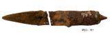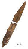 | Description / विवरण | A long knife with leaf shaped body and pointed top and sharp lateral blade edges with thick mid portion. It has copper hilt with pointed tang. |