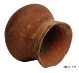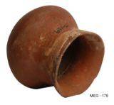 | Description / विवरण | A small red ware pot with round base and globular body, slightly carinated waist high neck with slightly everted thick rim. A pair of graffiti marks verticals with slanting strokes on the top on either side on the shoulder. Of fine fabric, it is treated with slip. |