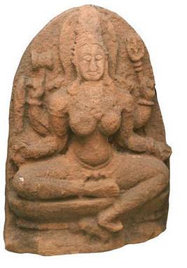 | Description / विवरण | Devi seated in ardha paryankasana posture on a pedestal. She wears ornamental kirita with a halo behind. The two ears are adorned with long kundalas and indistinct ornaments. The two rear hands hold Damaru and Trident. Her lower left hand holds a bowl and right hand holds a Khadga. |