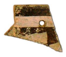 | Description / विवरण | Rim fragment of a slate colour bowl having a perforation below the incurved flat rim. Thick broad line is drawn in black colour just below the rim and another horizontal line connected to a vertical one below the perforation. Application of fine slip inside the jar. |