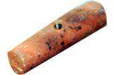 | Description / विवरण | Red colour cylindrical stone pendent having a perforation at the center of the body. Flat cut ends on either ends. |