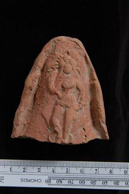 | Description / विवरण | Terracotta plaque preserving a standing female figure with right leg a bit bent forward. Right hand raised up while the left one is resting on her hip. She wears ornament headdress. Defaced. Feet gone. |