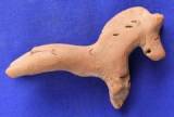 | Description / विवरण | Model probably of horse. The eyes are indicated by incised pellets. Nostrils and ears are mutilated. It has a long neck. Rows of circular punches and oblique lines over the body. Frontal and hind left legs are missing. |