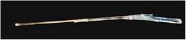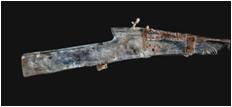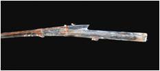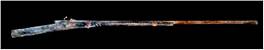 | Description / विवरण | A long barrelled gun tied to a teakwood stock with three bands. Stock channel is damaged and missing from middle part of barrel. The flaring mouth of the gun, with a moulded band, measures 12 cm in circumference. The stock has a offset at the top near breech end and at the bottom between a slot, a flat trigger connected to hammer is provided. stock is brownish due to patina and as usual barrel measuring 1.53 m in length is encrustred. |