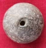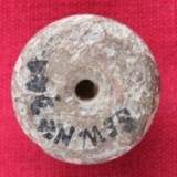 It is a terracotta arecanut shaped bead with having a central perforation. One side end of the bead has been flattened. For this it is richly stand with that flat base. Black slip is applied during the preferring condition.