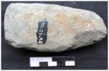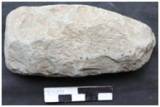 Fully flaked on the dorsal with marks of flaking along the lateral margin. Rest of the surface is covered with cortex. Margins are thick, roundish and convergent showing marks of working. Butt is moderately thick with pointed poll. Cutting edge is thick and slightly ground on the ventral with an edge line being nearly straight. Elliptical in median and indeterminate in longitudinal section.