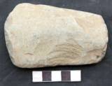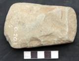 Bifacially ground retaining marks of flaking along the sides. The scars on the upper are big and flat. The dorsal is deep and small. Ventral surface is slightly convex and dorsal is flat. The edge is unofficially beveled on the under surface showing a convex edge. Butt is broken.