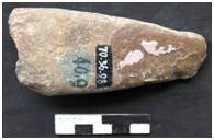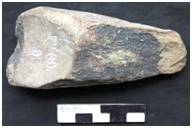 Roughly ground on the dorsal. Retaining marks of pecking on the ventral surface along the left margin. The lateral margins are moderately thick showing cortex all over on the ventral surface. Dorsal is concave towards the working end. The butt shows asymmetrically convex poll. Median section is rectangular. The side margins are straight and flaked from both the directions. The tool retains a big notch due to excessive use. Heavily patinated.