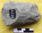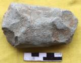 Made by flaking and bifacially flaked on the working end to prepare a convex edge. Edge line is irregular. Margins are thick showing marks of flaking. Butt is also thick with irregular poll. Median section is oval.