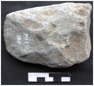 Fully flaked with one margin convex and the other being thick and straight showing marks of chipping along the margins. Patches of cortex in the dorsal. The tool is concave in ventral and concave in the dorsal. The working edge is abraded due to extensive use. The platform is uneven and irregular.