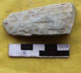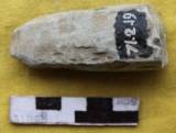 A narrow butt and pointed poll. Square in median section. The tool is partly broken near the platform. The working edge retains use marks. The tool is unevenly made from a pebble by straight hammering technique.