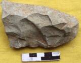 The tool chipped all over retaining deep flake scar on both the faces. The tool is uneven and crudely made up of a big river rolled pebble. The left margin of the tool retains some use marks in the form of notches.