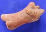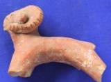 Model of a ram. The eyes are represented by incised pellets and curved horns which covered up the ears. The horns bear incised lines. Four legs and tail are missing.