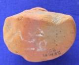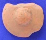 It is a terracotta lead. Base portion is flat. A rounded knob at the top portion. Edge of the base portion has been broken.