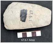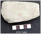 Ground convex on the ventral surface. Dorsal is flaked and flat margins are slightly convex with marks of flaking, blade is beveled on the dorsal with marks of retouch and convex edge line, butt is narrow with a flat biconvex poll. Triangular in longitudinal and nearly plano-convex median section.