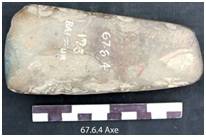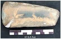 Partly ground on both the faces. Both the faces are convex with working on right lateral. The margins are thickly roundish retaining marks of chipping. Dorsal shows a bold scar. The working edge is bifacially ground and partly blunt. Butt is obliquely flat. Oval median section and lenticular in longitudinal.