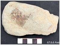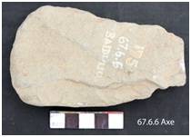 Made on a flake retaining big flat fake scars on the ventral surface. The dorsdal surface is worked along the left side. Butt is narrow with bi-convex poll. The left lateral margin is thin, sharp and concave, right is thick and convex. The edge is bifacially ground with convex edge line. Biconvex in median and sub-triangular in longitudinal cross section.