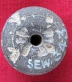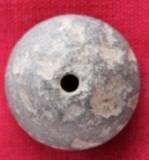 It is a terracotta areca nut shaped bead with having a central perforation. One side end of the bead has been flattened. For this it is richly stand with that flat base. Some chiselled marks are noticed on the object.