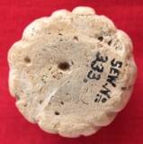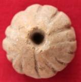 It is terracotta bad. Roughly oval in shape with a flat base. Upper portion is roughly circular with central perforation. The perforation is wider towards the top. Vertical lines are all around executed in preferring condition.