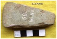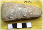 Roughly ground, retaining marks of chipping.Ventral is slightly convex dorsal is flat with beveling at the working edge. Margins are thick and flat. Right margin is thicker than the left. Butt is narrow with roughly triangular poll. Cutting edge is sharp and little convex. Nearly triangular in longitudinal and quadrangular in median section.