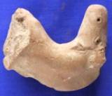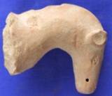 Head of a terracotta animal figurine. Eyes indicated by a deep incision. Ears are mutilated. The head with mouth bears two pin holed nostrils on either side for taying thread and use as toy.