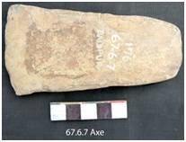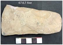 Partly ground, both the faces retaining stepped scars along lateral margins. Both the faces are flat and intersect at the cutting edge. The edge is bifacially ground with a convex edge line. The margins are little concave, butt is thin and convex. Eliptical in median and bi-convex in longitudinal section.