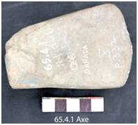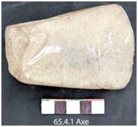 The implement is grounded and polished retaining used marks in the working end. The core is thick and generally tapers towards the working edge. The tool is thick in section and is heavy. Flake scars have been removed from both the sides near the platform for facilitating hafting.