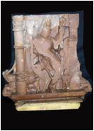 Within the two pilasters, Siva depicts as a dancer. The principal image of Siva is highly clipped off, left pilaster is also missing. Siva contains six hands, the upper right hand holds damaru , middle right hand stretches crosswise, the lower right hand is missing. The upper left hand holds a serpent now damaged and the rest hands are missing. Near the damaged right leg, Nandi bull and to the left corner, a standing male figure holds the indistinct object is presented. To the outside of the right pilaster it contains an elephant. Siva wears a decorated matted Mukuta.