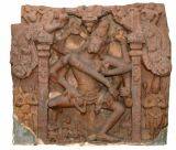 | Description / विवरण | Siva as Nataraja in a niche flanked by two slender pilasters. His right leg absent is broken while the left leg is firmly planted on the ground. It is eight armed. The lower front right hand is turned inwards towards left hand in lola hasta posture across the body and touching the knee where as the left front hand is turned towards right with the palm kept open. The two rear hands hold the flowing jatas locks of hair on either side. Of the remaining hands the one lower right hand is in chinmudra while the left hand holds akshamala. There is a makara torana motif on the top with celestial nymphs flying in the air on the top. Below the figure in the niche at the bottom are devotees worshiping in anjali mudra. Outside niche i.e. by the side of the pilasters are standing images of dwarapalas with folded hands. The ornaments include necklace, a long yajnopavita, udarabandha and short lower garment. |