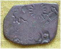 | Description / विवरण | The coin is an imperial type of Punch- marked coin. The shape of the coin is irregular. Obverse Sun, animal, six armed wheel and other symbols are indistinct. Reverse Symbols are indistinct. |