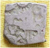 | Description / विवरण | The coin is an imperial type of Punch-marked coin. The coin is irregular in shape. Obverse Sun, six armed wheel, crescent topped three arched hill and other three symbols are indistinct. Reverse Two indistinct symbols. |
