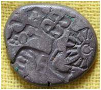 | Description / विवरण | The shape of the coin is circular. Obverse Sun, caduceus, six armed wheel, Srivatsa, animal and other symbols are indistinct. Reverse Indistinct symbol. |
