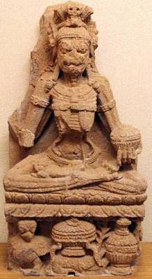 | Description / विवरण | The four armed Chamunda is seated in Padmasana pose over a double petalled lotus pedestal below the pedestal the vehicle of the goddess is depicted. Her right principal hand holds a wine pot and the rest hands are broken. She has been adorned with a skull on her head. She has a sunken belly. She wears armlets, ear-rings, and a mekhala. She wears a kunchabandhana and a lower garment on her waist. She adorned a yajnopavita. |