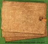| Description / विवरण | The set consists of three copper plates attached to a broken copper ring half of which is lost. At the end of the other half of the ring is soldered the royal seal of bronze. Which is very much corroded. Traces of the motifs are slightly visible on its counter sunk surface, bearing in relief, the seated Gajalaksmi in the padmasana posture, flanked by an elephant on either side, with rising stems. The fist plate is inscribed on its inner face only while the second and third have writing on both side. The first plate contains 17 lines. The second plate first side contains 17 lines and second side contains 8 lines. The third plate obverse side contains 17 lines, reverse side contains 16 lines. There are altogether 75 lines of writing on three plates. The language is Sanskrit, and script is Eastern variety of northern alphabet. The charter records the grant by Mahabhagupta, of the village Agaravadanula in favour of Govindakara of the Krusnatreya gotra. |