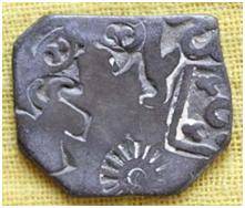 | Description / विवरण | The coin is an imperial type Punch- marked coin. The shape of the coin is irregular. Obverse A Sun, animal, humped hull, four taurine around a circle with in a square box and some indistinct symbols. Reverse Three arched hill with crescent at the top. |