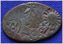 | Description / विवरण | The coin is an imperial type of Punch- marked coin. The shape of the coin is oval. Obverse Sun, tree, six armed wheel, nandipada topped caduceus. Reverse Taurine, crescent and some indistinct symbols. |