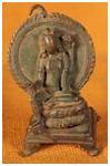 | Description / विवरण | Here, Buddhist learning God Manjushree is seated in lalitasana on a lotus pedestal. He has two hands right hand is in Varada mudra touches his right knee, while left hand holds the stalk of an utpala supporting a book which rests on the Visva-padma. The lotus pedestal is placed on a footed moulded pedestal. He is wearing ear rings, necklace, armlets, bangles, anklets and katibandha. Behind the deity a solid circular halo with a raised boarder having a beaded tine is depicted. |