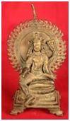| Description / विवरण | It is an image of Manjushree, seated in Lalitasana on a double petalled lotus pedestal. This image having two hands, right hand is in Varadamudra while the left hand holds a lotus stalk. Her hair is arranged in decorated ornament design. She wears ear rings, necklace, armlets, bracelets waist band, anklets and upavita. A decorated oval halo is placed behind the image. The image right foot rests on a lotus leaf. The back side of the pedestal bears an inscription. |