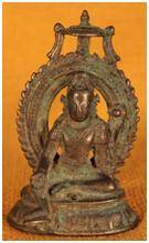 | Description / विवरण | The face of this icon is rubbed off. Clothed in an antariya, held by a beaded girdle, and an Uttariya worn in an Upaviti fashion, the two armed Lokesvara is decked in valayas, beaded armlets, a broad ornate necklace, an Upavita and a short beaded crown with three ornate triangular projections. With his pendant right foot on a lotus, the Bodhisattva, with auspicious lines around the neck, half-closed eyes and a contemplative facial expression, is seated in the lalitasana on the pericarp of a lotus with a single row of hanging petals, the lotus seat, oval on plan, is hollow within. His right palm, placed against his right knee. |