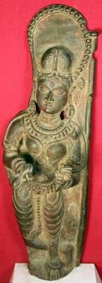 | Description / विवरण | Here an attending Goddess is standing with her bent right leg crossed behind her straight left leg. She has two hands, right hand holds a container while left hand holds a chmara of which the lowest part of the handle alone is preserved. She is adorned with a mukuta, and wearing necklace, armlets, bangles, anklets, katibandha, earings, and lower garments. Behind the head is an oval halo with a beaded borden is depicted. The image is attached with a wooden base. |