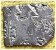 | Description / विवरण | It is an imperial type of Punch-marked Coin. The coin is rectangular in shape. One corner is distorted. Obverse Contains five symbols i.e. Sun, elephant, deer, taurine, six armed. Reverse Contains five symbols i.e. Aqurious, two arch hill, Moon, Sun, other are indistinct. |