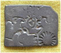 | Description / विवरण | It is an imperial type of Punch-marked Coin. The coin is rectangular in shape, but one corner is broken. Obverse Contains five symbols i.e. Sun, animal, taurine, other are indistinct. Reverse Contains four symbols i.e. Sun, Caduceus, other are indistinct. |