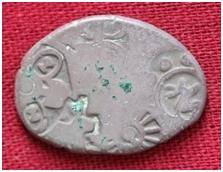 | Description / विवरण | It is an imperial type of Punch-marked Coin. The coin is irregular in shape. Obverse Contains 5 symbols i.e. Sun, six armed, wheel, Ujjain, animal figure, Taurine within a circle. Reverse Contains 2 minute symbols i.e. Moon on three arched hill, other symbol is indistinct. |