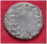 | Description / विवरण | It is an imperial type of Punch-marked Coin. The coin is circular in shape. Obverse Contains 7 symbols i.e. Sun, six armed, fish within a circle, wheel, caduceus, two taurine within a box, flower, other is indistinct. Reverse Contains 5 symbols i.e. Moon on three arched hill, human figure, Sun, other 2 symbols are indistinct. |