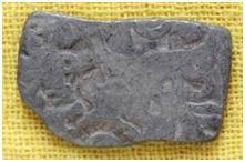 | Description / विवरण | The shape of the coin is irregular. Obverse Contains 5 symbols i.e. Sun, six armed, wheel, three arched hill, tree, Caduceus. Reverse Contains 3 minute symbols i.e. Sun, square, other symbols indistinct due to abrasion. |