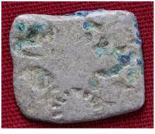 | Description / विवरण | The shape of the coin is irregular. Obverse Sun and other symbols are indistinct. Reverse Symbols are indistinct due to silver sulphide formation. |