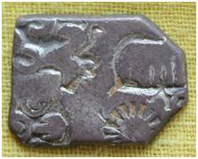 | Description / विवरण | The coin is an imperial type Punch- marked coin. The shape of the coin is irregular. Obverse Sun, elephant, animal, six armed and other symbols are indistinct. Reverse Three arched mountain and other symbol are indistinct. |
