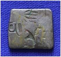 | Description / विवरण | The shape of the coin is rectangular. This is an imperial type of punch marked coin. Obverse Sun, three arched hill six armed symbol, animal and two indistinct symbols. Reverse Three arched hill crescent on the top and an indistinct symbol. |
