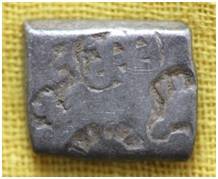 | Description / विवरण | The shape of the coin is rectangular. This is an imperial type of punch marked coin. Obverse Caduceus, six armed symbol within a chakra and fish. Reverse Blank. |